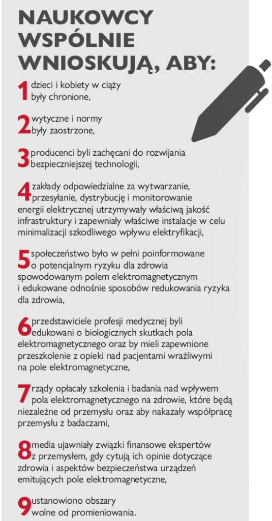 - rządy opłacały szkolenia i badania nad wpływem pola elektromagnetycznego na zdrowie, które będą niezależne od przemysłu oraz aby nakazały współpracę przemysłu z badaczami,