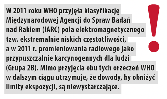 W 2011 roku WHO przyjęła klasyfikację Międzynarodowej Agencji do Spraw Badań nad Rakiem (IARC) pola elektromagnetycznego tzw. ekstremalnie niskich częstotliwości, a w 2011 r. promieniowania radiowego jako przypuszczalnie karcynogennych dla ludzi (Grupa 2B). Mimo przyjęcia obu tych orzeczeń WHO w dalszym ciągu utrzymuje, że dowody, by obniżyć limity ekspozycji, są niewystarczające.
